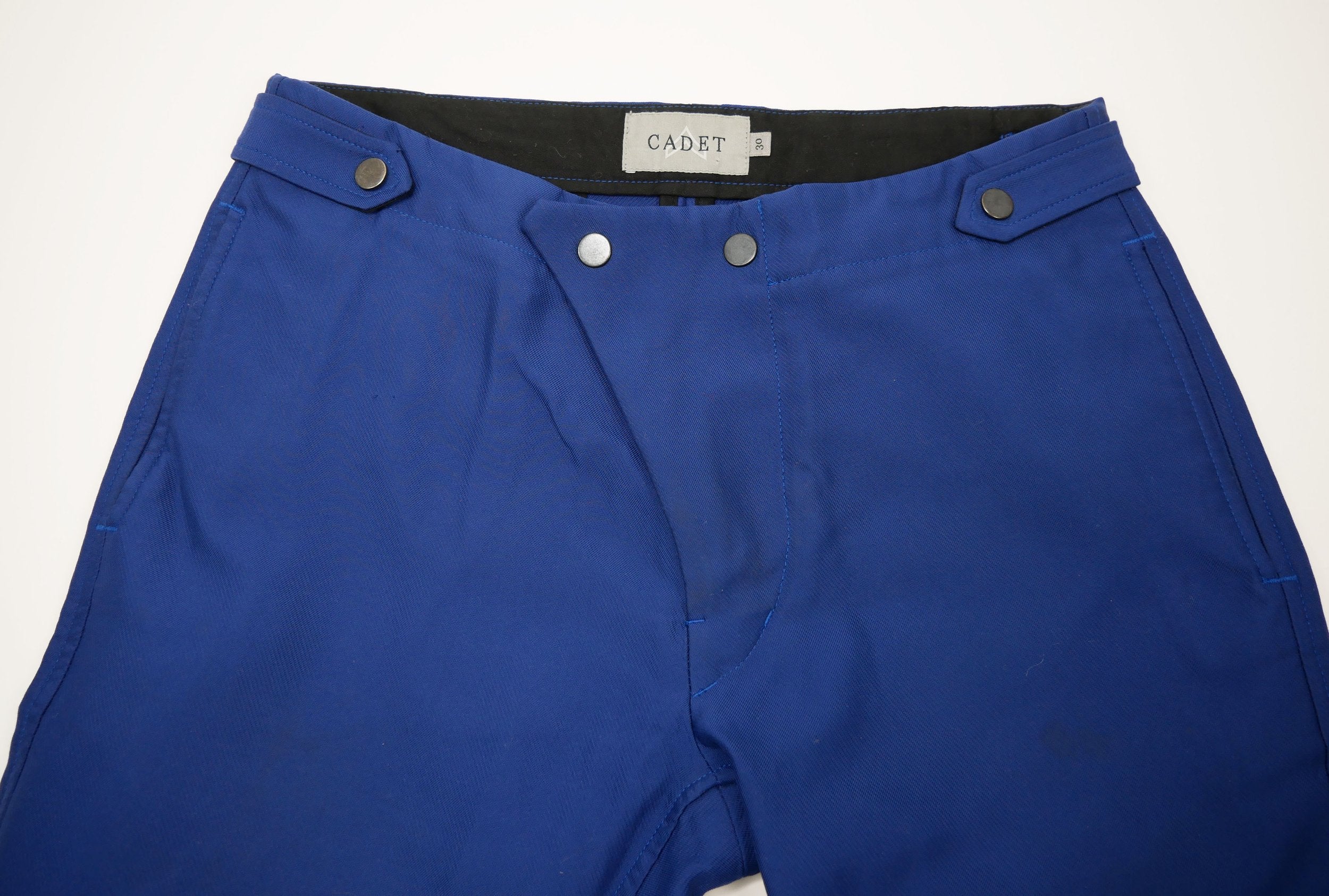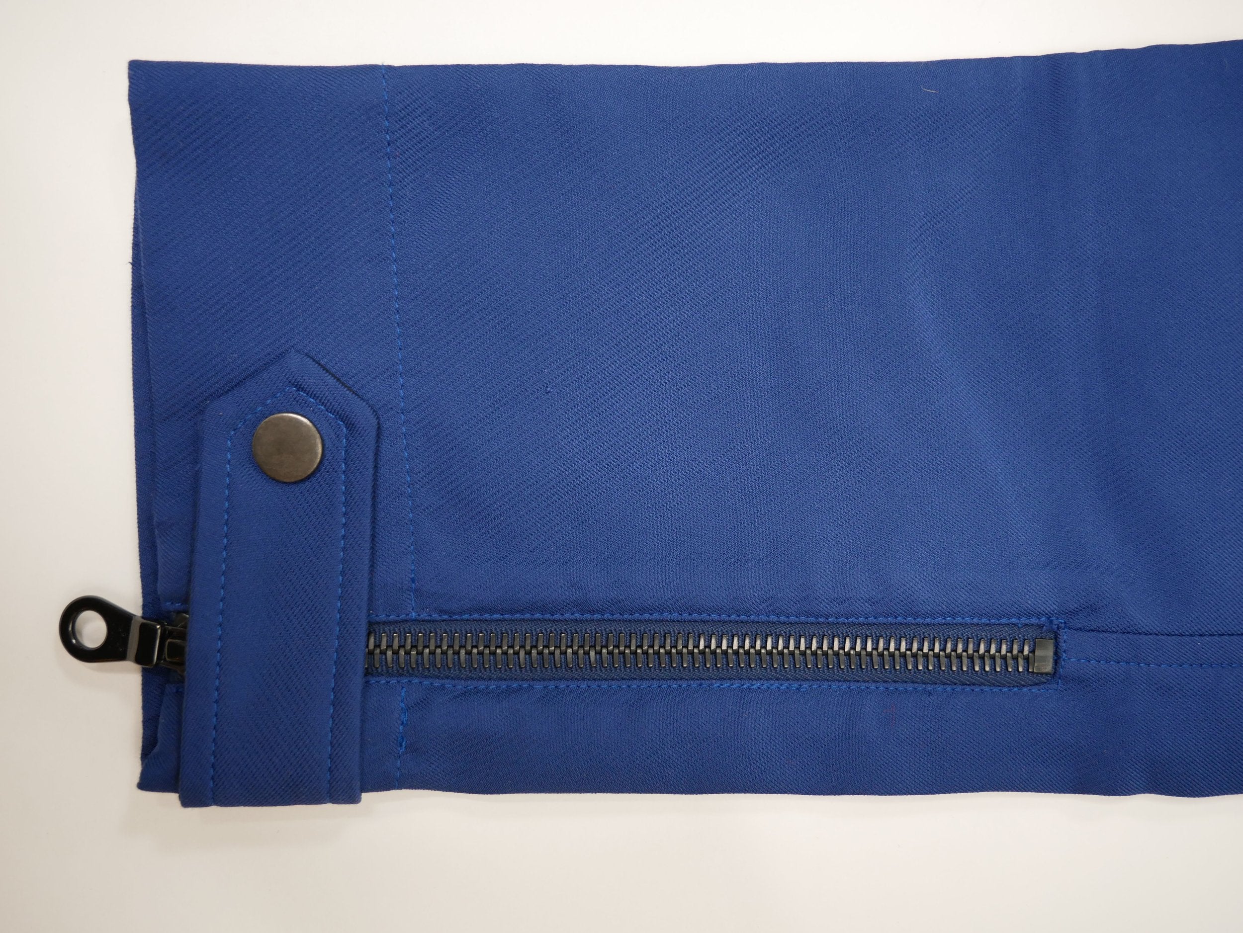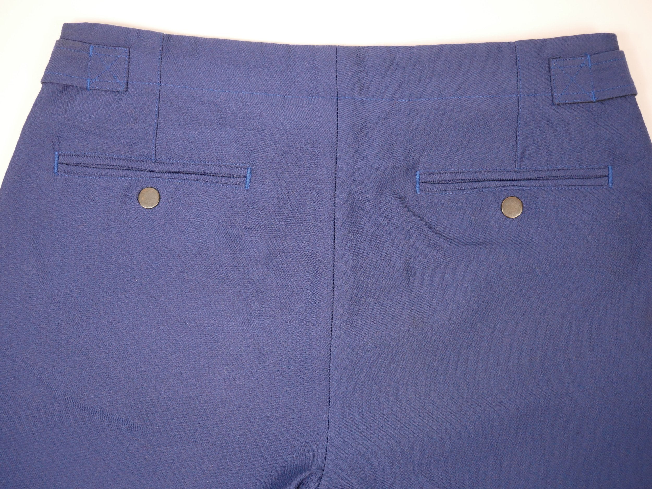 Size 30 Made in US, Snap closure, military- style with asymetrical snap fly, tapered cuffs with zippers, adjustable belt at back waist, back pockets with snaps.