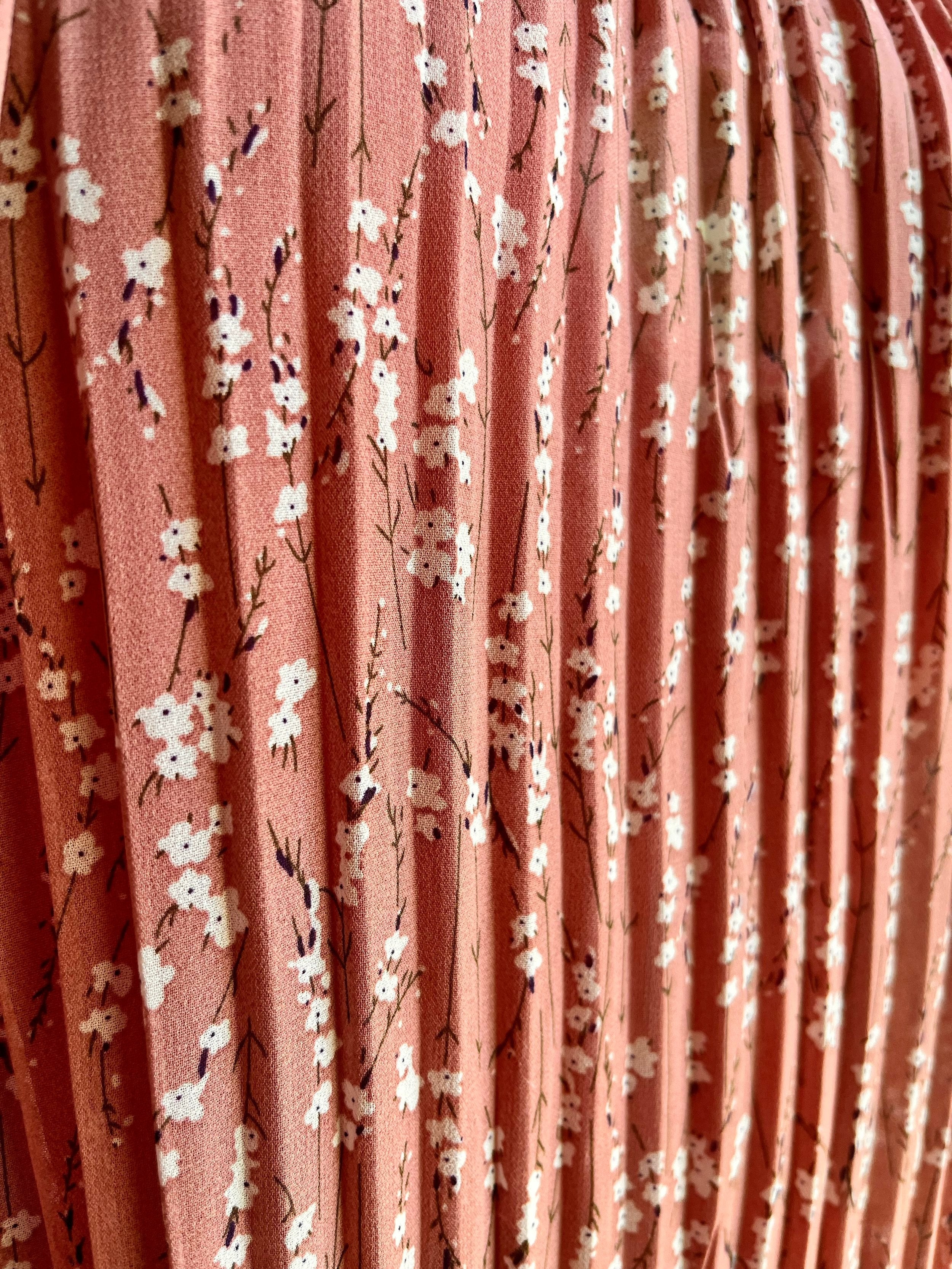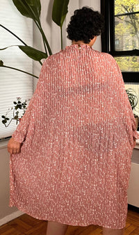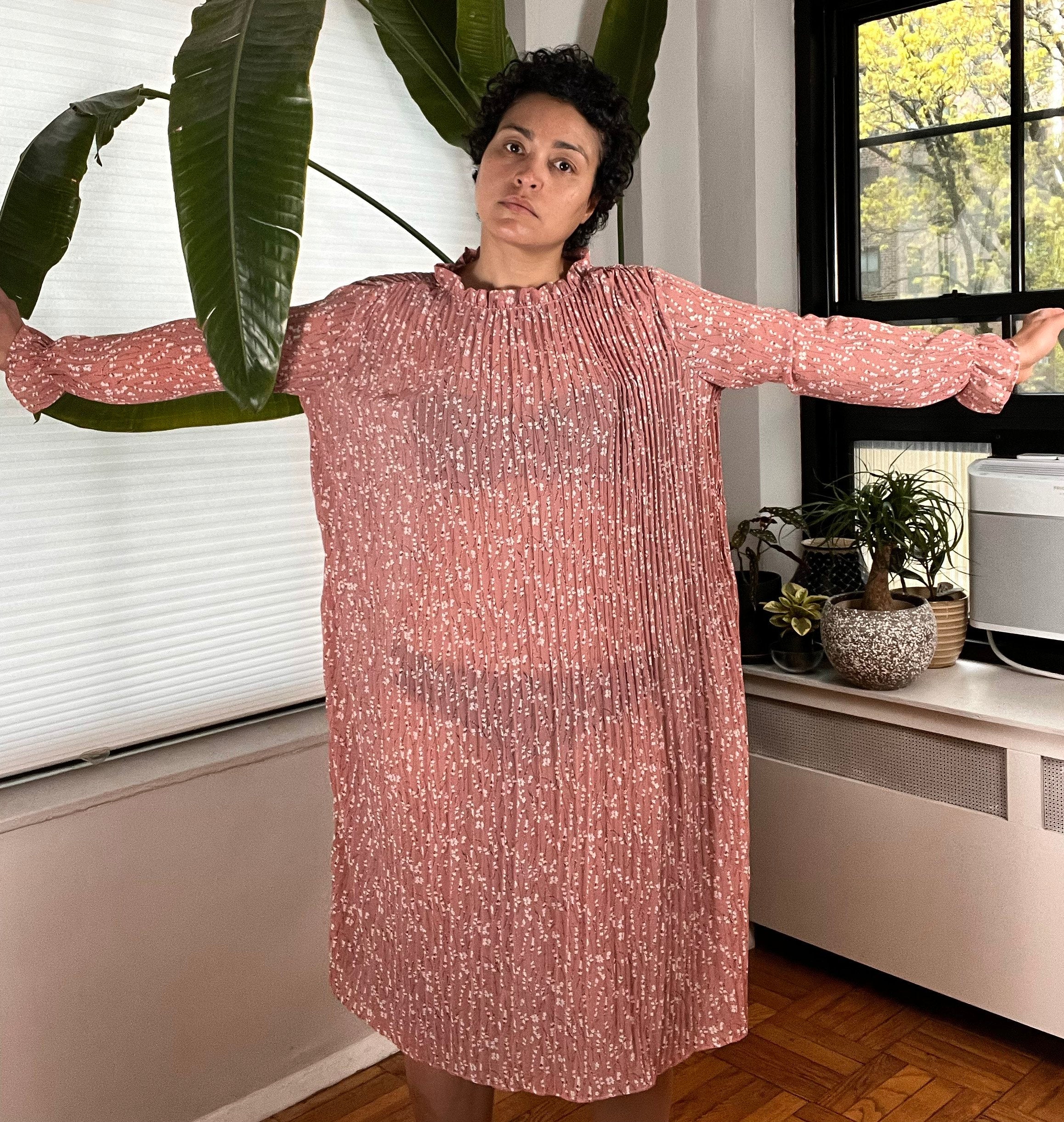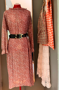 Elastic wrists, elastic hook and plastic bubble button, fabric belt loops on sides, not lined, see through. Pleated dress and sleeves. Ruffled collar, free and flowing easy spring / summer dress.